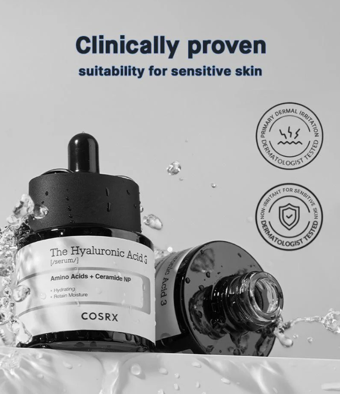 COSRX Hyaluronic acid 3 Serum is suitable for all skin types and particularly beneficial for dry and dehydrated skin, especially for those experiencing flaky skin, makeup clumping, or who are looking to enhance their skin's moisture retention..