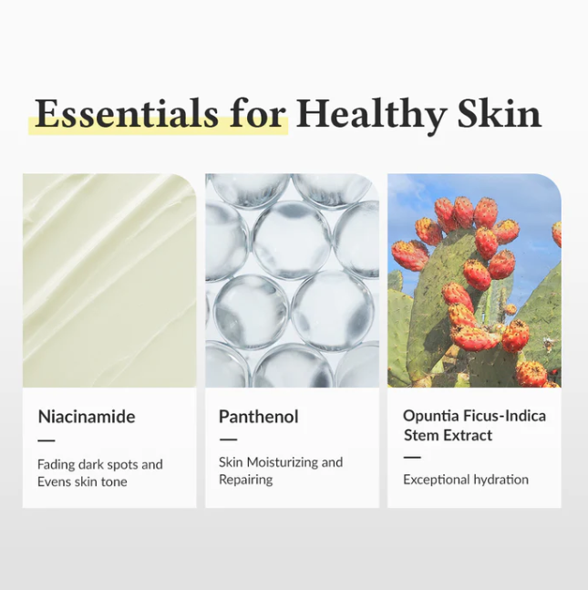 This cream contains a potent blend of Niacinamide, Panthenol, and Opuntia Ficus-Indica Stem Extract, each present in significant concentrations (10,000ppm), delivering numerous benefits for the skin. Niacinamide, or Vitamin B3, enhances the skin's moisture barrier, regulates oil production, fades dark spots, and promotes an even skin tone. Panthenol provides effective hydration, aids in healing minor irritations, and soothes redness. Opuntia Ficus-Indica Stem Extract offers exceptional hydration and is ideal for dry or sensitive skin. The cream's multi-layered structure ensures long-lasting skin nourishment and hydration through concentrated plant-based hydrators and hyaluronic acid.