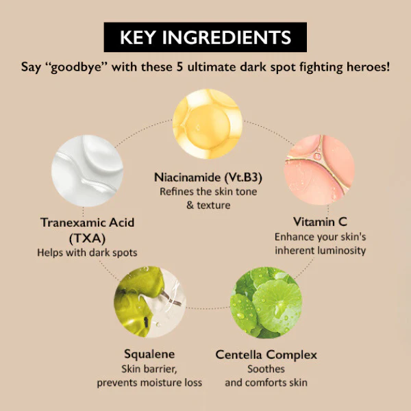Tranexamic Acid helps with dark spots and Squalene prevents moisture loss