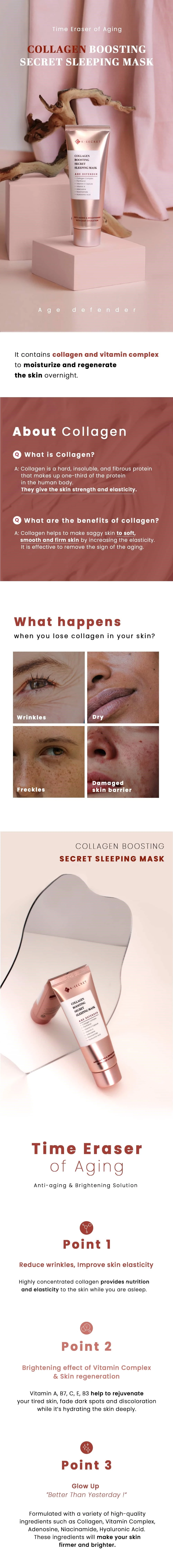 Simply apply it before going to bed! This sleeping mask is formulated with a variety of high-quality ingredients such as Collagen, Vitamin Complex, Adenosine, Niacinamide, Hyaluronic Acid. These ingredients will make your skin firmer and brighter!