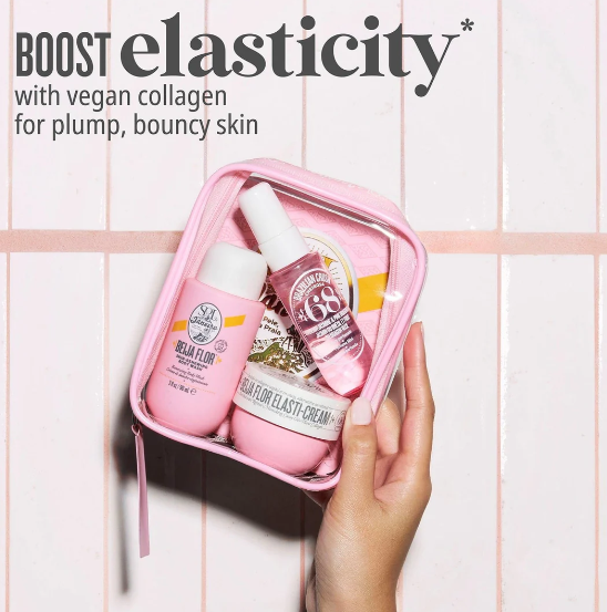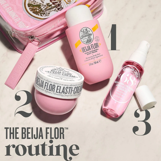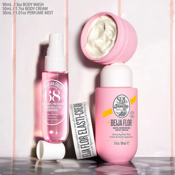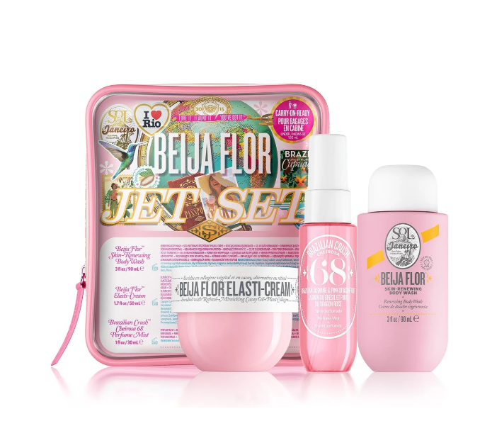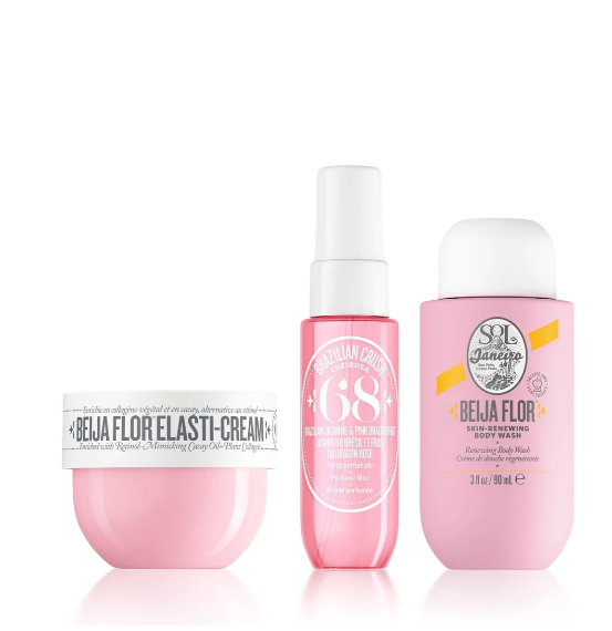 Your travel-friendly routine for visibly smoother skin. Start by cleansing with Beija Flor Body Wash, then smooth on collagen-boosting* Beija Flor Elasti-Cream. Finish with the bright scent of Cheirosa 68 Perfume Mist.