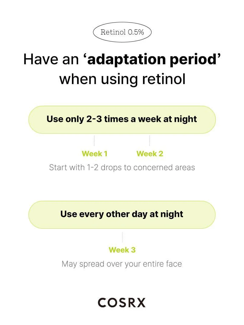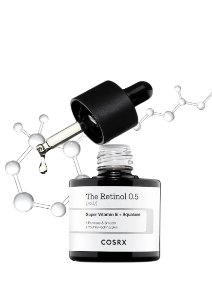 COSRX The retinol 0.5 oil is formulated with 0.5% pure retinol, designed for users who are accustomed to retinol and seeking a more potent option to combat signs of aging. It targets deep wrinkles, fine lines, loss of skin elasticity, and uneven texture and tone. It also helps reduce pore size and improves skin firmness.